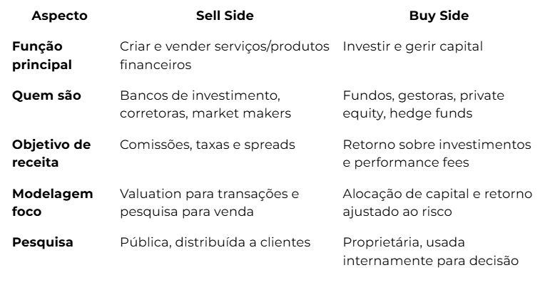 Enquanto o sell side presta um serviço e é remunerado por taxas, o buy side assume o risco econômico da decisão, buscando retorno ajustado ao risco por meio da compra de ações, títulos ou participação em empresas.